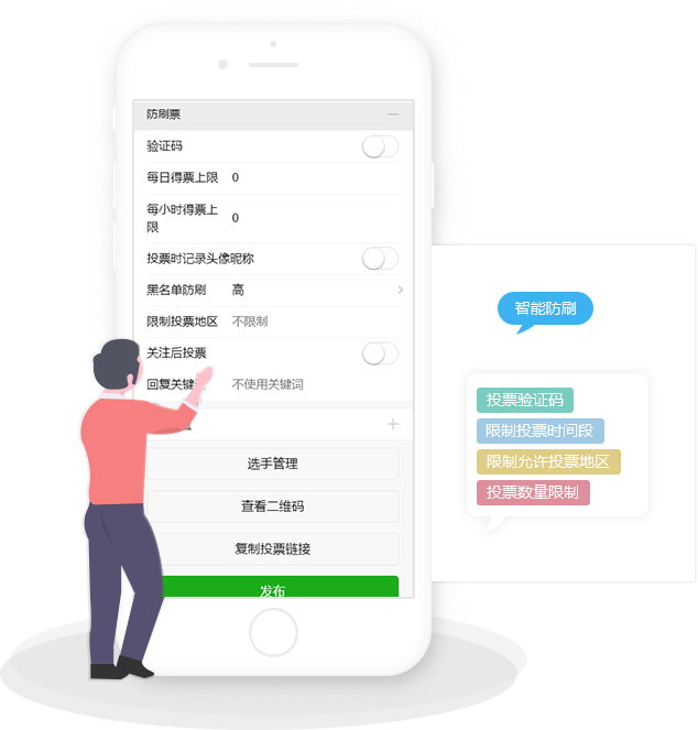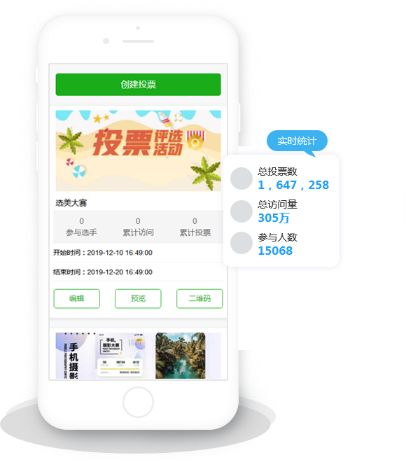 即見(jiàn)即所得,實(shí)時(shí)手機(jī)預(yù)覽,一分鐘即可創(chuàng)建投票活動(dòng),無(wú)需任何專業(yè)知識(shí)。